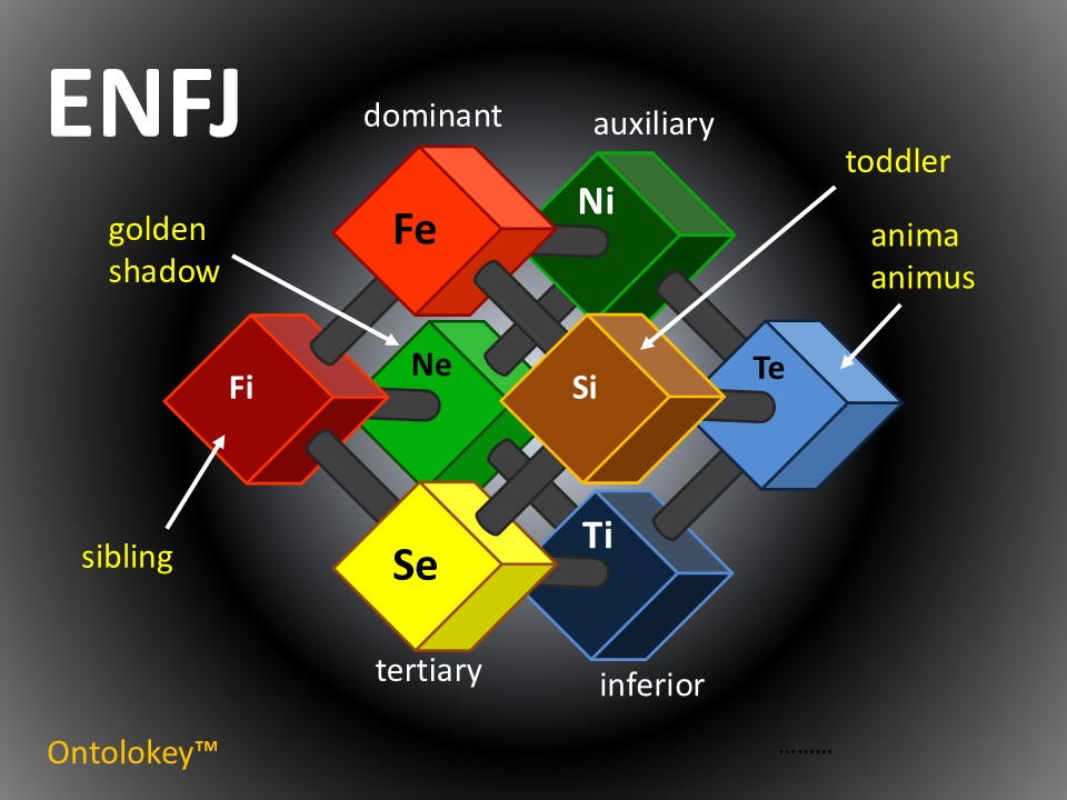 Fe is the ‘camera’ in Ontolokey’s tripod analogy, and is stabilized by three supporting legs: the auxiliary, sibling, and toddler functions. Understanding these connections is vital to grasp the full scope of the ENFJ’s psychological landscape.