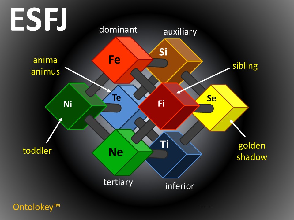 The Ontolokey cube places this evaluative capacity—extraverted feeling (Fe)—at the forefront, supported by a trinity of interconnected yet functionally opposed orientations. The ESFJ’s psychological vitality depends on how these tensions are managed.