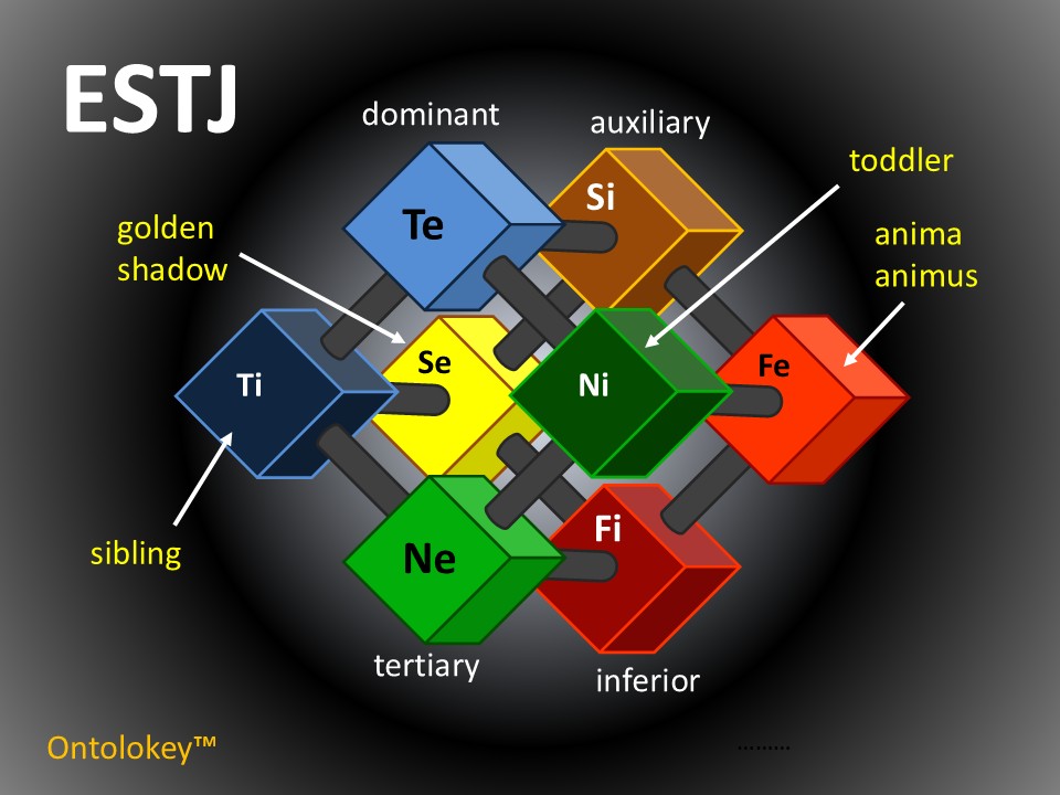 The ESTJ is classified as an extraverted, rational type. Their dominant function, extraverted thinking (Te), is balanced and challenged by a full spectrum of cognitive functions, organized in the Ontolokey cube: three immediate structural supports (Sibling, Toddler, and Auxiliary), and four deeper unconscious components (Inferior, Tertiary, Anima, and Golden Shadow). By examining each function within this multidimensional context, we gain a fuller understanding of the ESTJ not as a static identity, but as a dynamic process of individuation and integration.