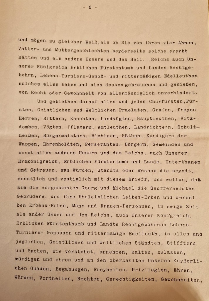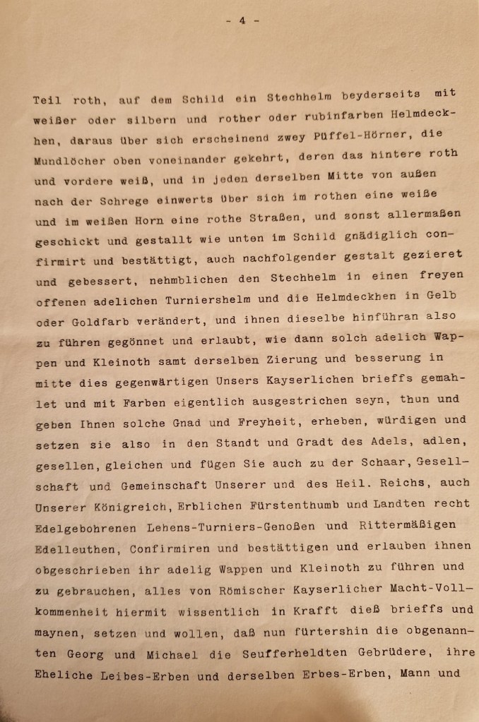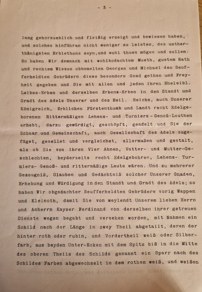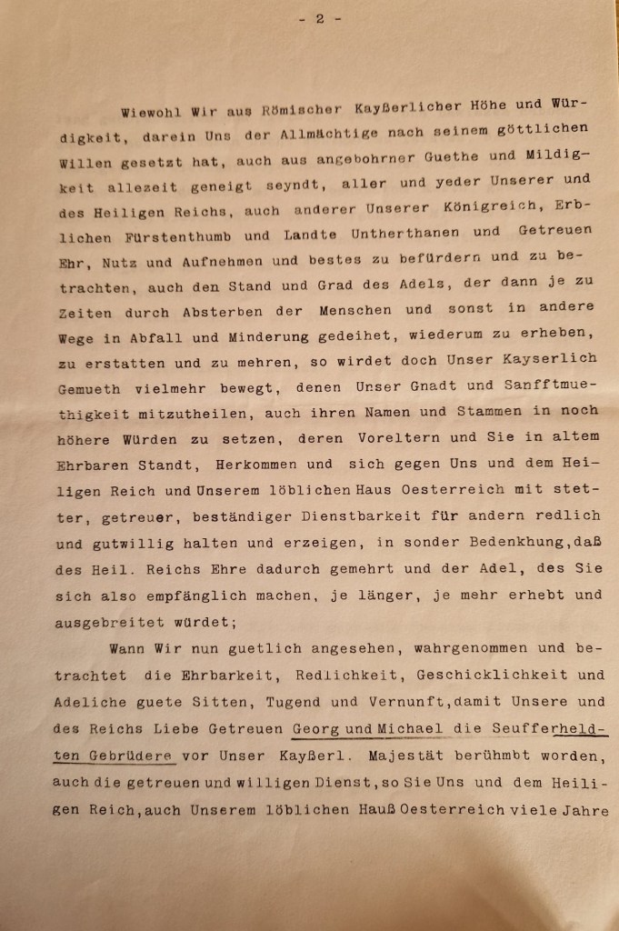 The Seufferheld family received a coat of arms on August 16, 1562, and was elevated to nobility December 10th, 1577 by Roman Emperor Rudolf II. The noble titles were renewed in 1771 and for the last time in 1821 in Frankfurt am Main (Germany), after which the family no longer used them. The letter of nobility and the family coat of arms can be found in the Austrian State Archives. Notable descendants included Georg Heinrich Seufferheld, Marquard Georg Seufferheld, Johann Georg Seufferheld, and Heinrich Seufferheld, the great-uncle of Jorge Eduardo Seufferheld. The family was mistakenly considered extinct with Max Seufferheld, the grandfather of Jorge Eduardo Seufferheld.