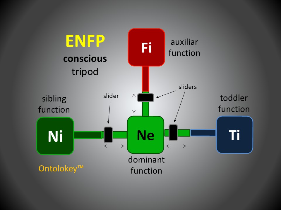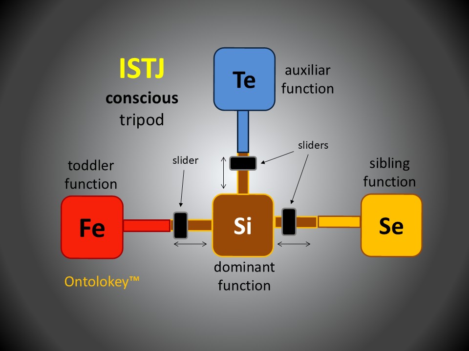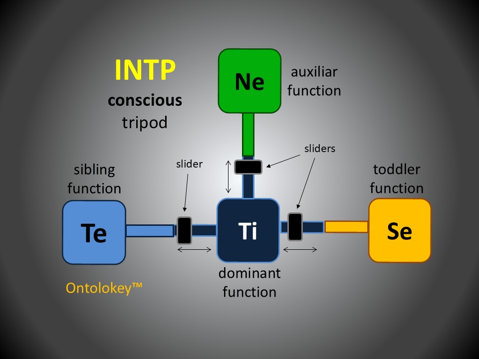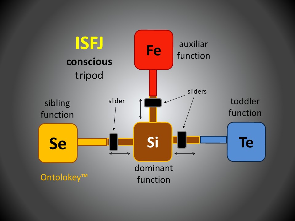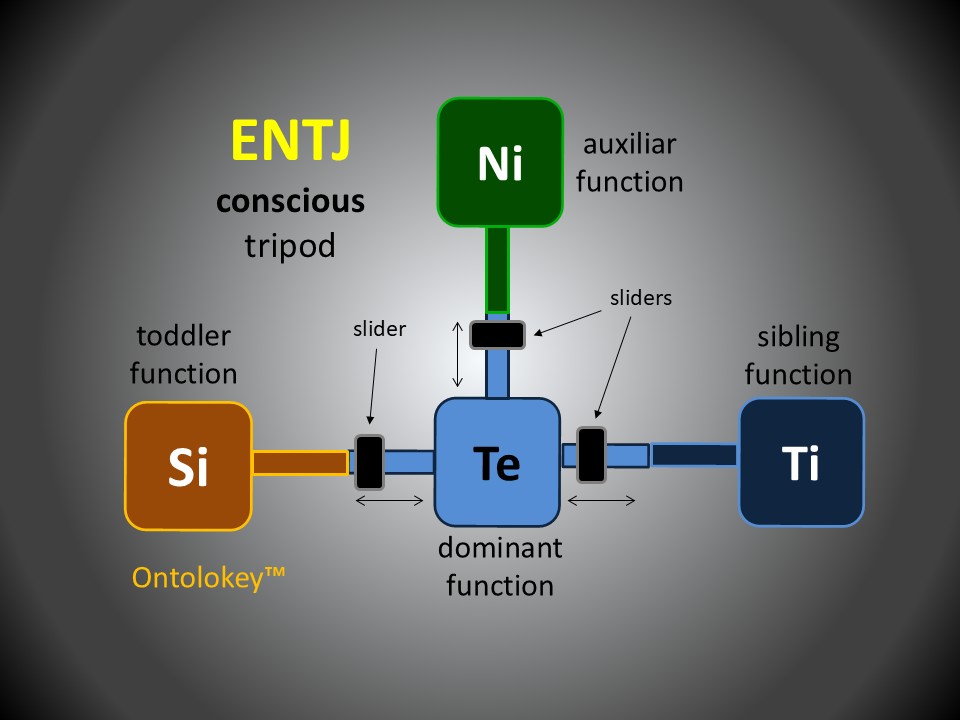 The tripods are located at the respective corners of the Ontolokey cube, the dominant function is the head of the tripod, and the 3 legs consist of the auxiliary function, the sibling and the toddler.