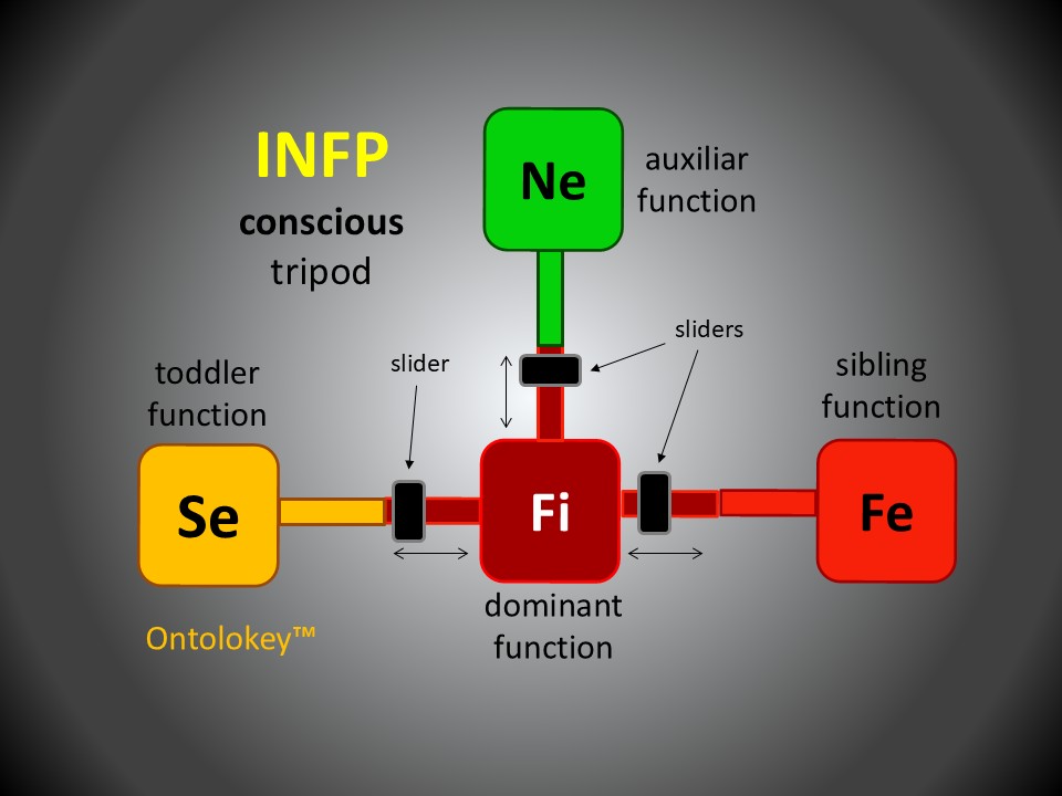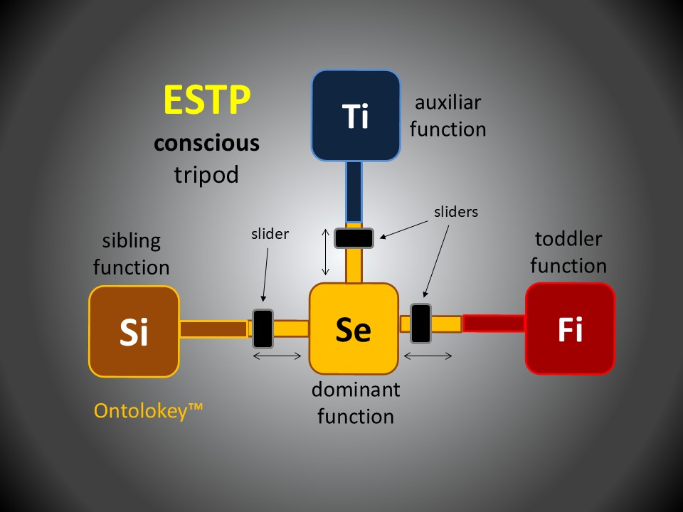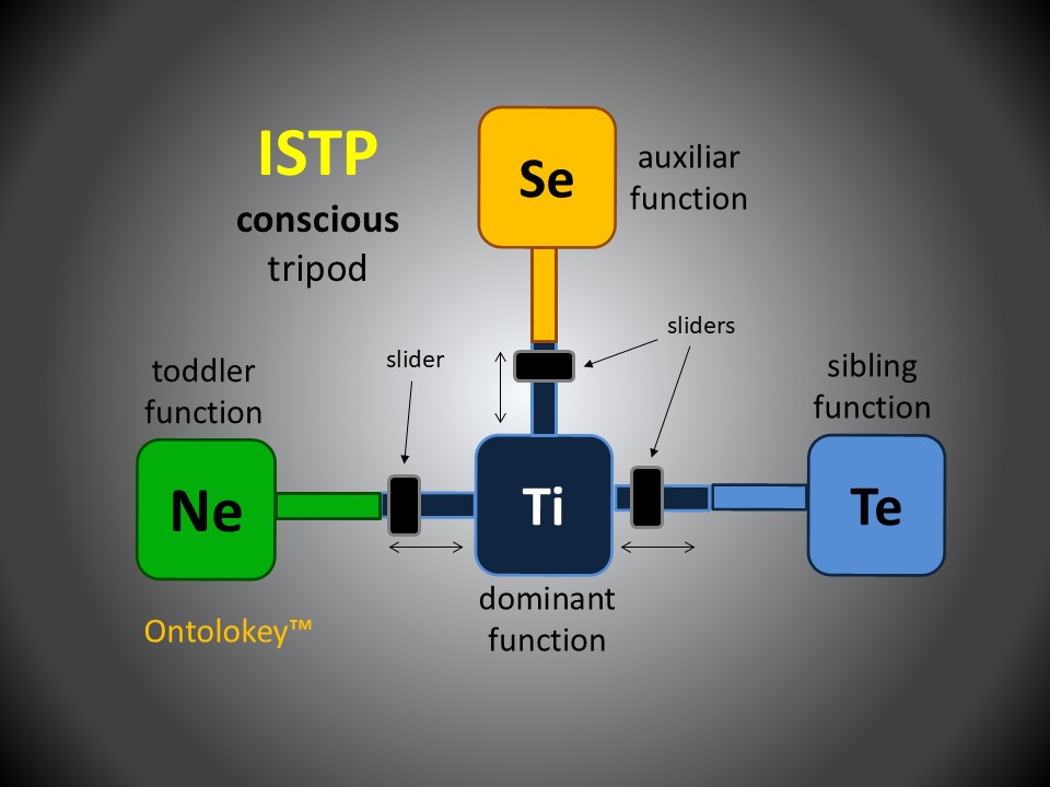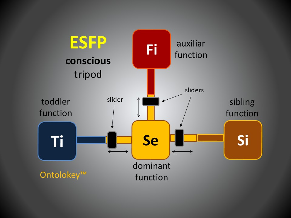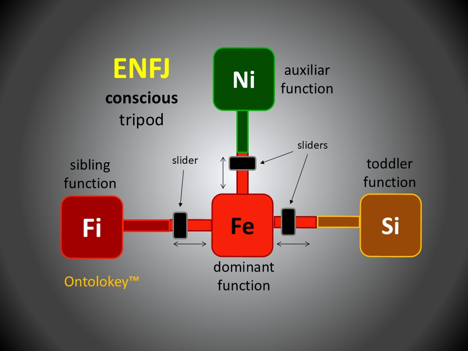 The tripods are located at the respective corners of the Ontolokey cube, the dominant function is the head of the tripod, and the 3 legs consist of the auxiliary function, the sibling and the toddler.