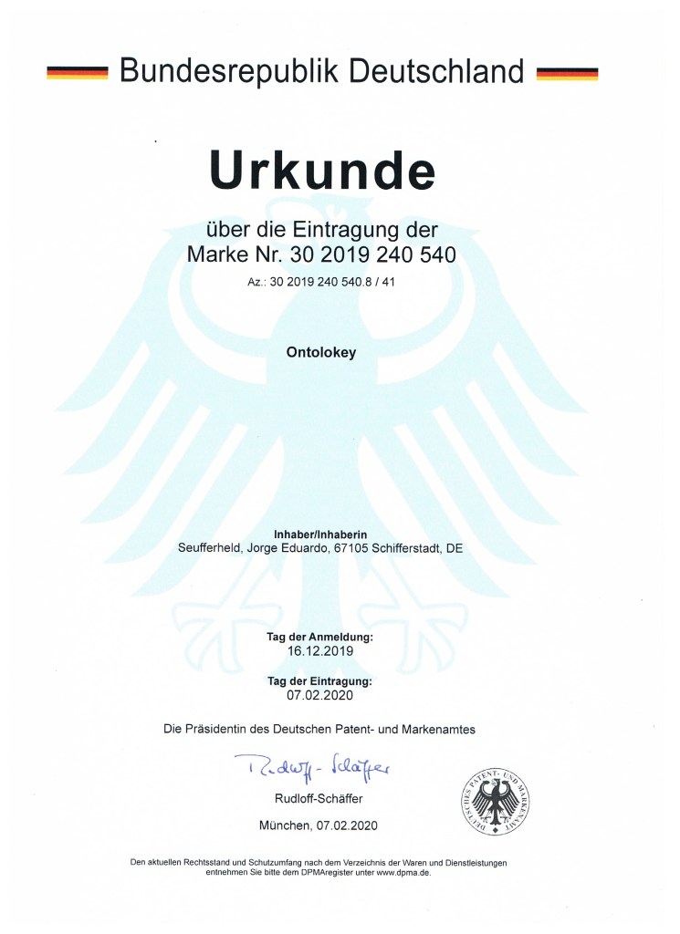Ontolokey is a registered trademark, officially recorded in the register of the German Patent and Trademark Office (Deutsches Patent- und Markenamt, DPMA) under registration number 302019240552. The protection period of the trademark commenced on the filing date and extends until December 16, 2029. In accordance with Section 47 of the German Trademark Act (Markengesetz), this protection may be renewed for additional ten-year periods. Furthermore, Ontolokey is registered as a word mark under registration number 302019240540, ensuring comprehensive legal protection of both the name and its conceptual integrity.