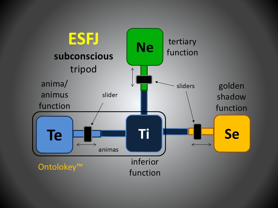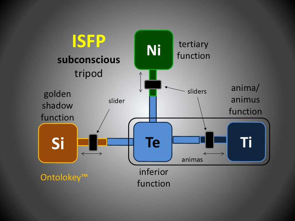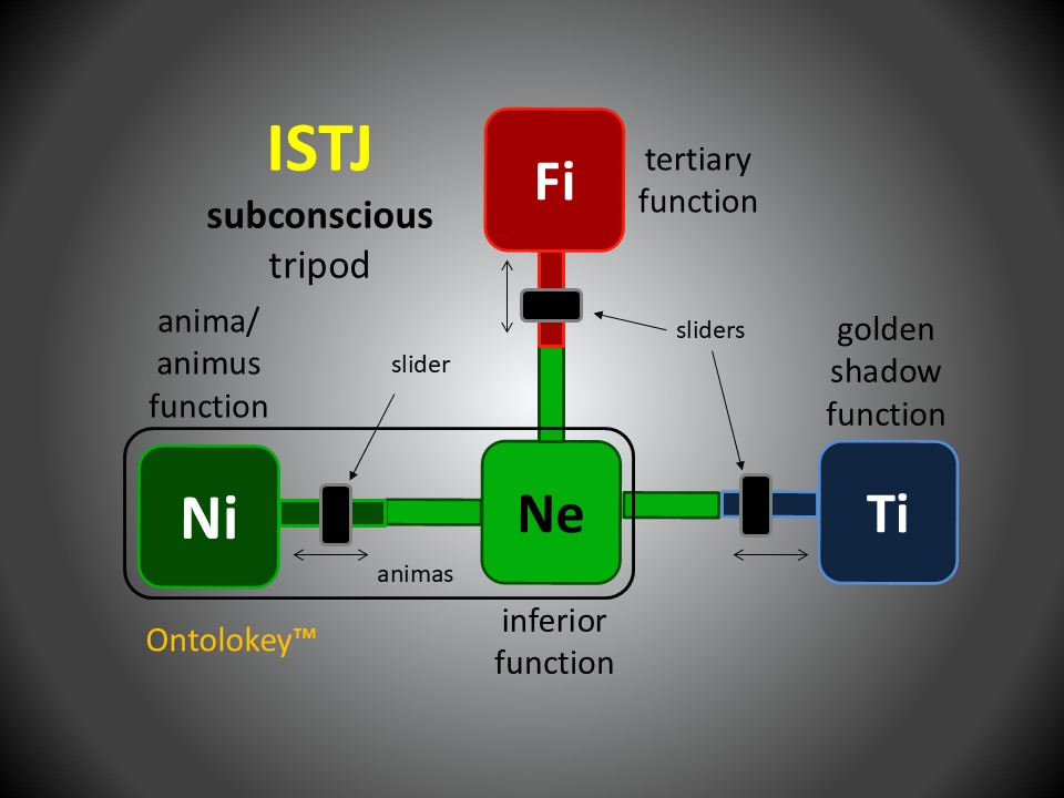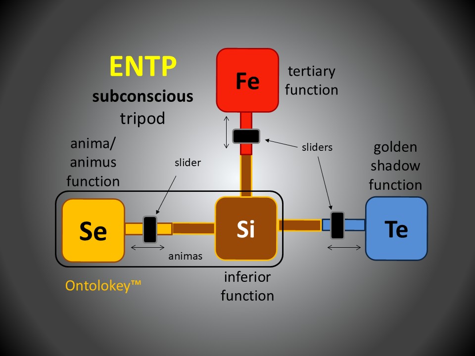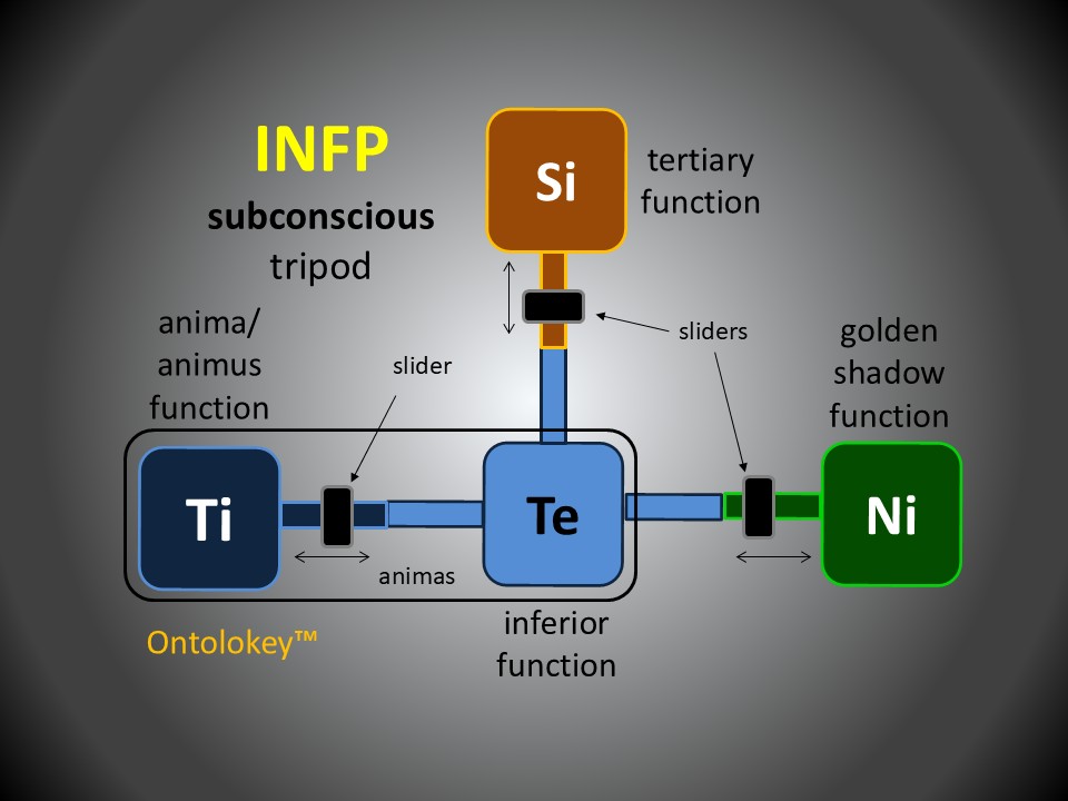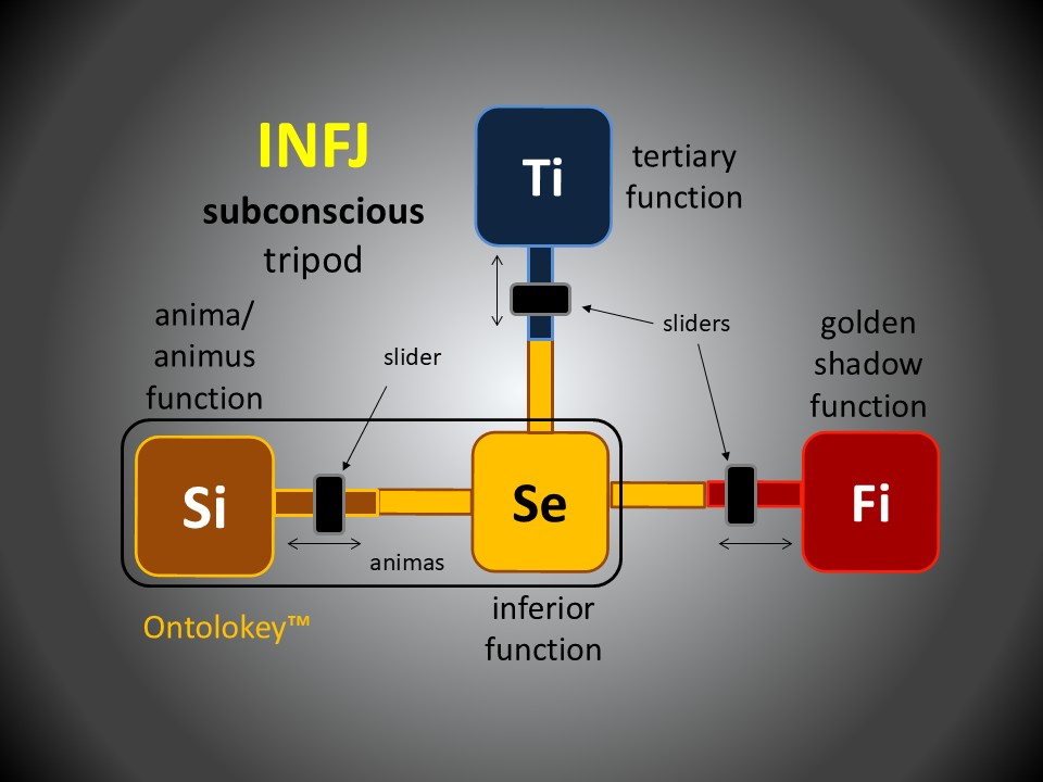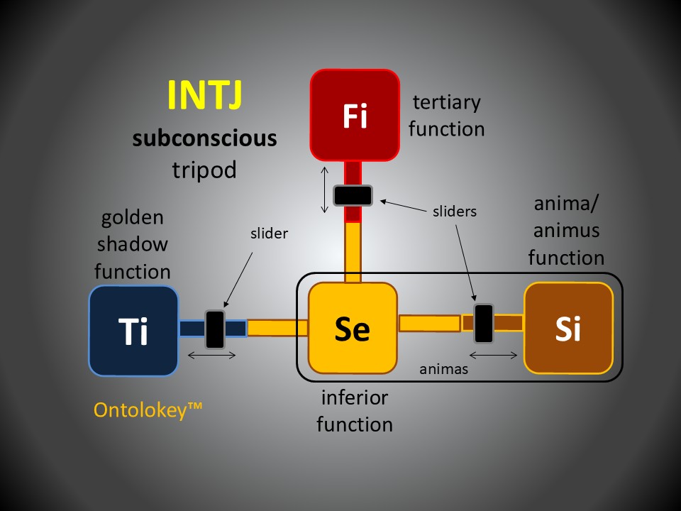 The shadow tripods are located at the respective corners of the Ontolokey cube opposite the dominant functions, the inferior function is the head of the tripod, and the 3 legs are made up of the tertiary function, the inferior anima/animus, and the golden shadow.